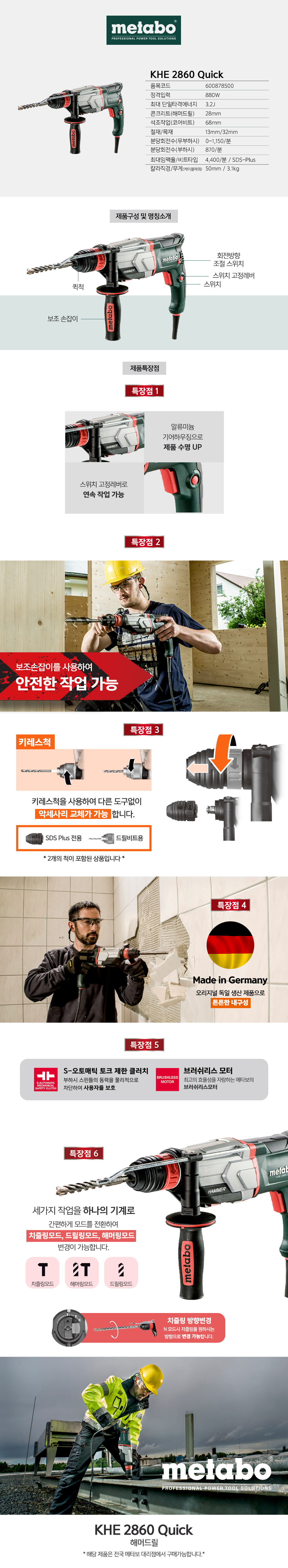 ■ Made In Germany 오리지널 독일제품 ■ 정교한 각도 및 튼튼한 내구성 ■ 알루미늄 기어하우징으로 제품수명 연장 ■ 스위치 고정레버로 연속작업 가능 ■ 3가지 작업모드(치즐링, 해머드릴링, 드릴링) ■ N모드시 치즐링 방향변경 가능 ■ 키레스척 사용하여 도구없이 간편하게 악세사리 교체 ■ SDS-Plus척, 드릴비트용 척 포함제품 ■ S-오토매틱클러치 - 부하시 스핀들의 동력을 전자적으로 차단하여 안전작업